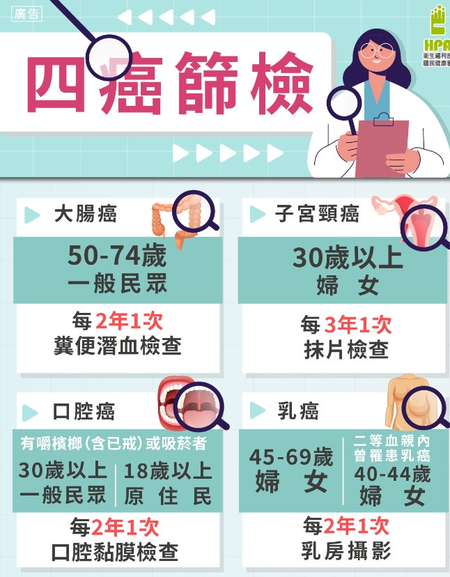 (108-112年)」,業將四癌(子宮頸癌、乳癌、口腔癌及大腸癌)篩檢列為公務
