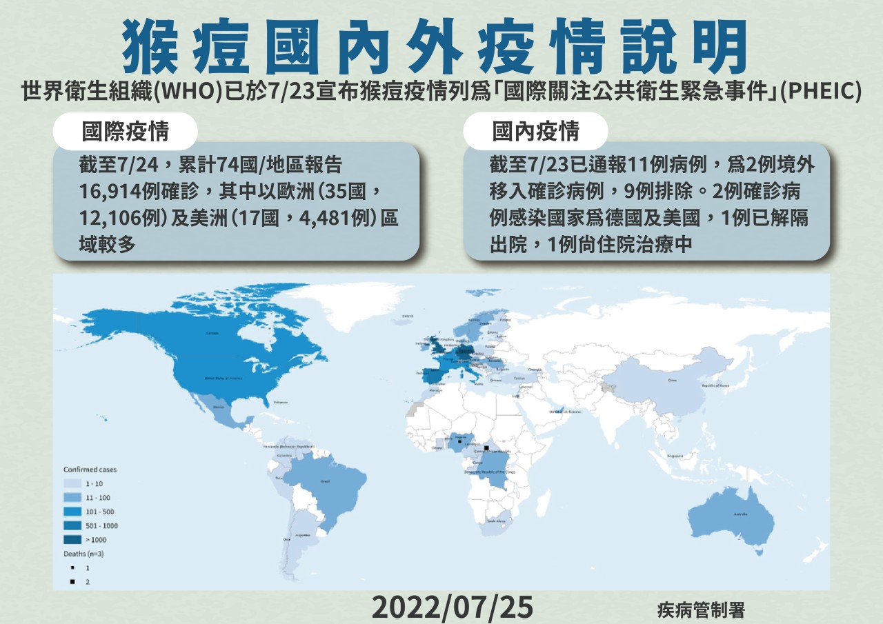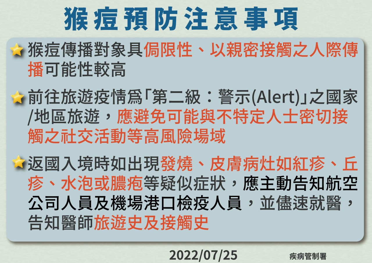 近期世界各國持續出現猴痘病例,民眾如前往旅遊疫情為「第二級:警示(Alert)」之國家/地區旅遊,應避免可能與不特定人士密切接觸的社交活動等高風險場域。